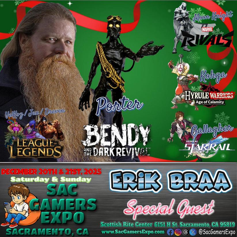 Erik Braa is known as the Viking of Voiceover. He got his start in video games and has garnered success in all areas of acting. He is most well known as the voice of Draven, Jax and VelKoz in League of Legends, Gallagher in Honkai: Star Rail, Kohga in Hyrule Warriors: Age of Calamity, and most recently known for Porter in Bendy and the Dark Revival, and Moon Knight in Marvel Rivals. He has lent his voice to 100's of games, from Heroes of the Storm and many Blizzard titles, to The Walking Dead game for Telltale Games.