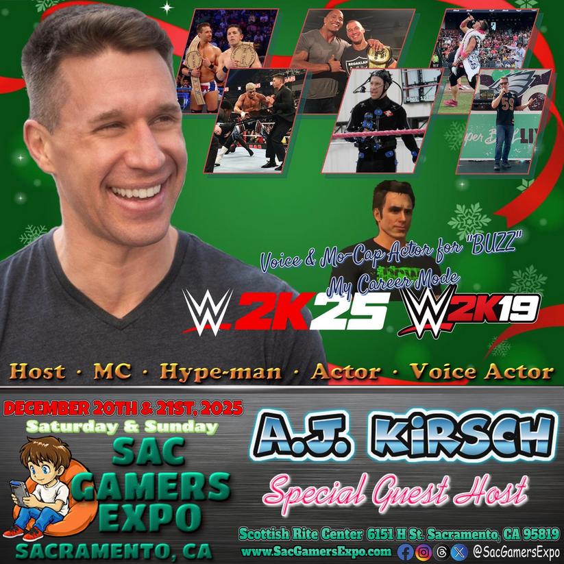A.J. Kirsch has carved out quite the career for himself both in and out of gaming. Within the world of gaming, he's most recognized for providing the voice and motion-capture for "Buzz," the main character in MyCAREER mode of WWE2K19, WWE's flagship video game. His voice can also be found in WWE2K25 and Mafia: Definitive Edition. Outside of gaming, A.J. has a decorated history with pro wrestling, having won Dwayne "The Rock" Johnson's "Rock the Promo" competition and making it to the final four contestants in reality show "WWE Tough Enough." A.J. is also an actor in dozens of commercials, major movies, and several TV shows, but is busiest as a host, MC, hype man, presenter, and announcer for live and televised events of all kinds including conventions, fundraisers, conferences, combat sports, festivals, and nightlife events. He has hosted events leading up to and at the past three Super Bowls, he's host and PA announcer at other NorCal conventions including StocktonCon and Fire & Ice RGX, and more recently, he became the new in-game host for the social media sensation baseball team, the Savannah Bananas, and their arch-rivals, the Party Animals. Sac Gamers Expo is thrilled to have A.J. as our official host!
